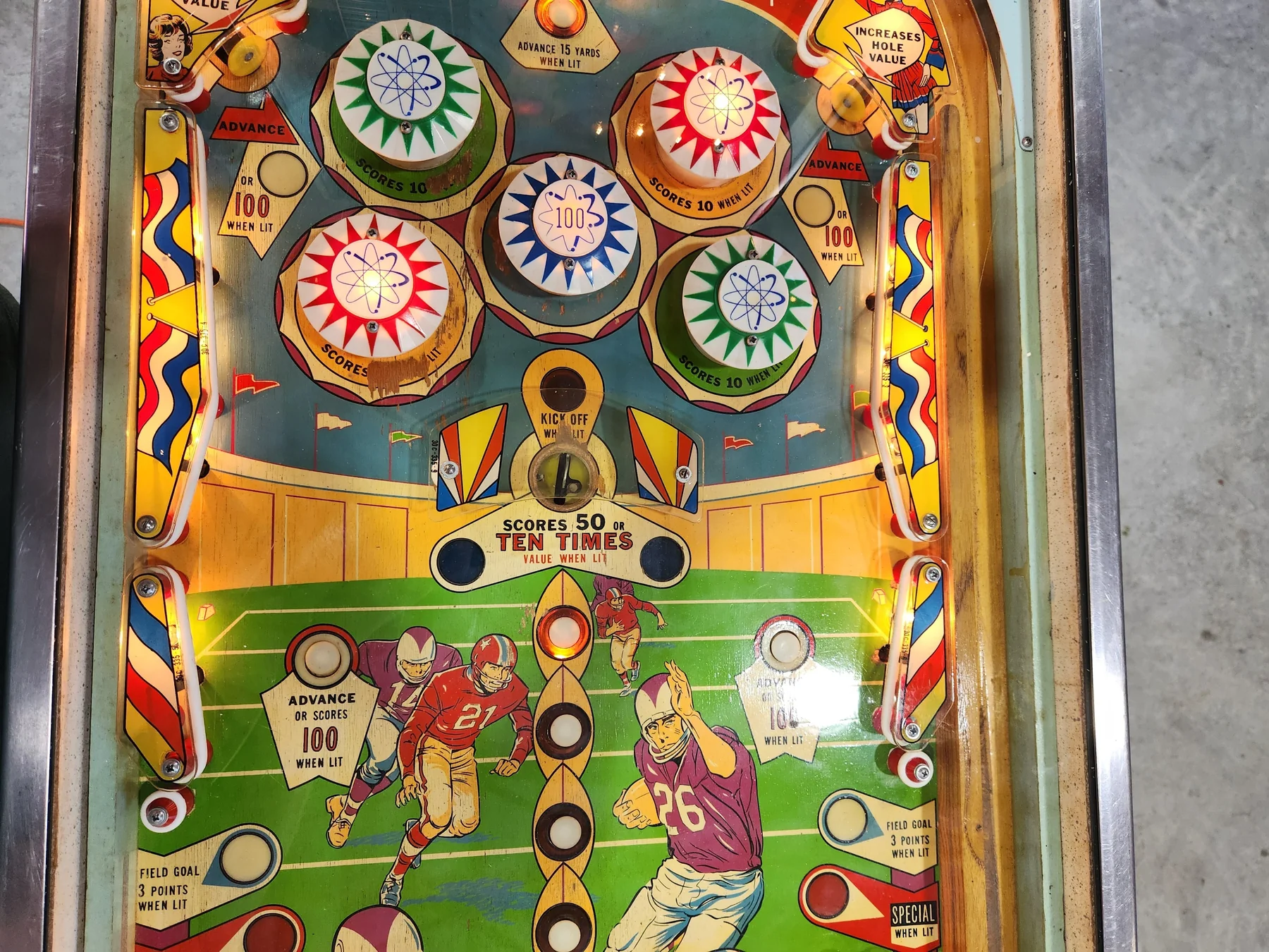 The artwork on the backglass and playfield showcases the timeless style of 1960s sports-themed pinball games. While there is some minor flaking on the glass—clearly shown in photos—the overall presentation remains visually striking. Normal wear and tear is expected for a machine of this vintage, but it displays beautifully and plays great.